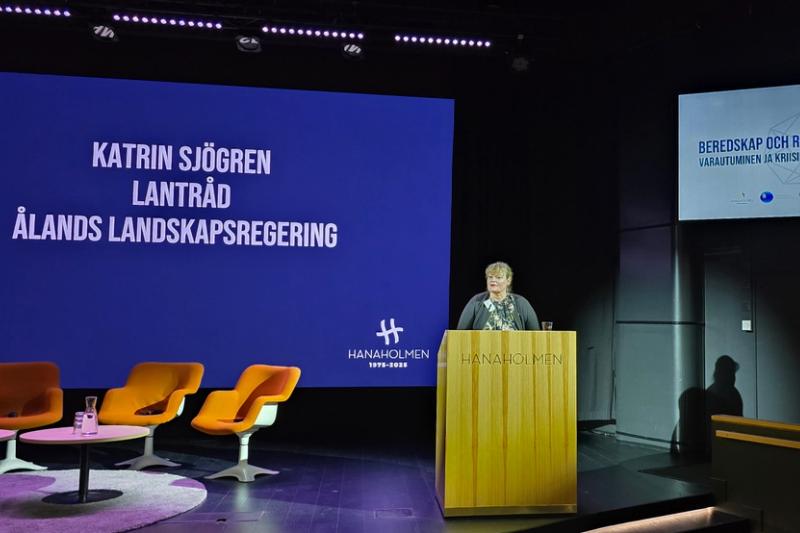 Lantrådet Katrin Sjögren medverkade under torsdagen i seminariet "Beredskap och resiliens i Norden" som ordnades på Hanaholmens kulturcentrum i Helsingfors.