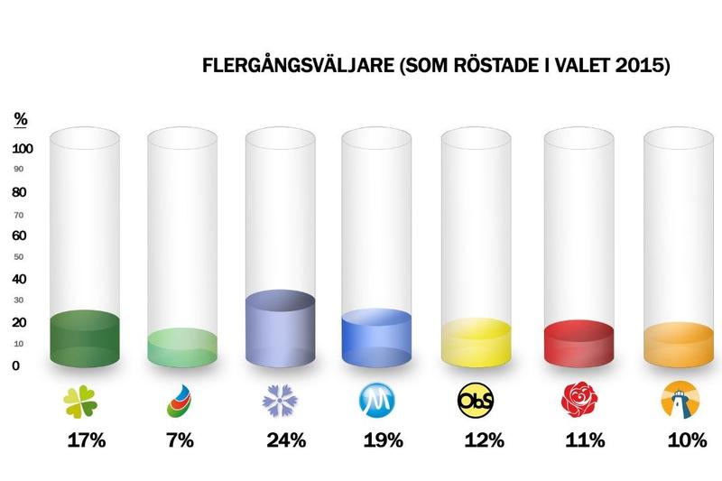 Även bland dem som röstade i senaste valet ligger Liberalerna på topp, med Moderat samling och Centern på andra respektive tredje plats. Resultatet är viktat mot hur man röstade i valet 2015. Sammanlagt 307 personer deltog i pejlingen och materialet samlades in av de studerande och bearbetades av Ålands radio.