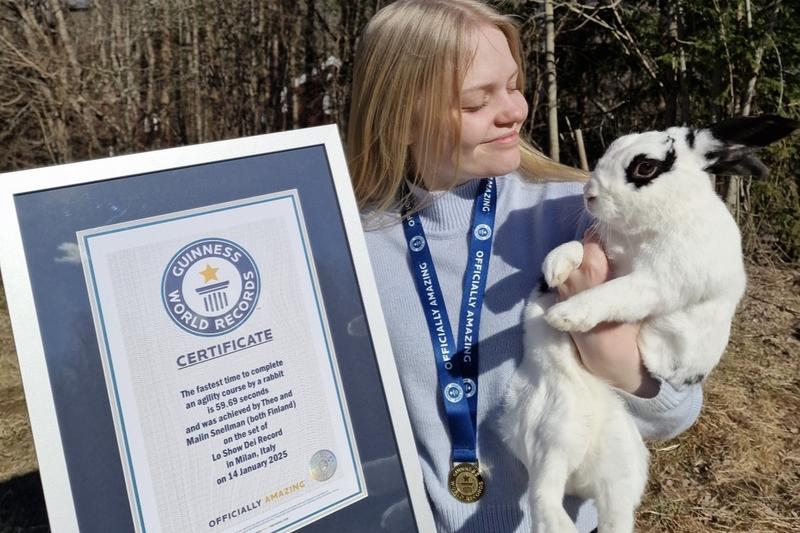 Malin Snellman och hennes kanin Theo tog sig nyligen in i Guinness rekordbok som snabbaste kanin på en agilitybana med tiden 59,69 sekunder.