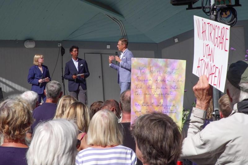 Jerker Örjans hade med sig en skylt till torget. Skylten pryddes av budskapet “Vi är trygga utan atomvapen” Orsaken enligt Örjans är att president Stubb välkomnat atomvapen till Finland.