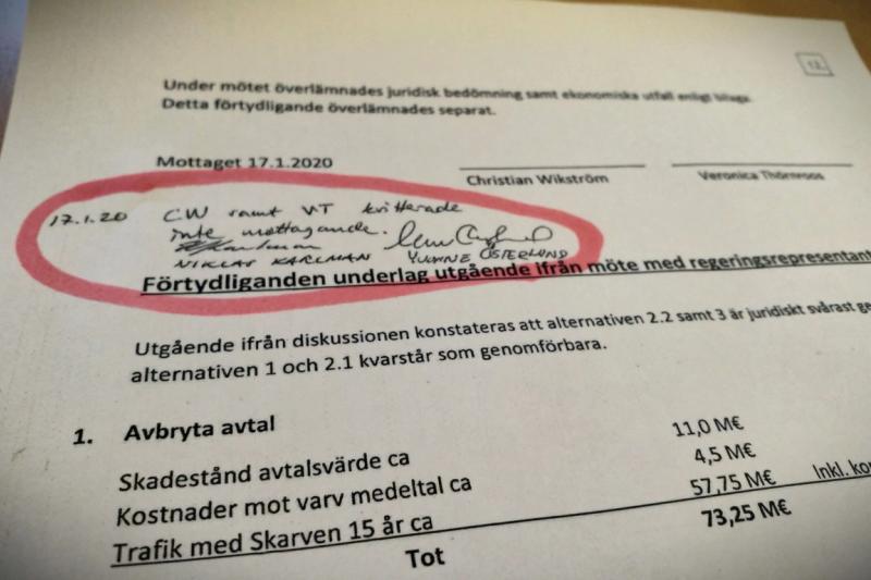 I ett tilläggsdokument till mötet den 17.1.2020 har landskapets tjänstemän begärt att lantrådet Veronica Thörnroos och minister Christian Wikström intygar att de tagit del av informationen. Citat: “Under mötet överlämnades juridisk bedömning samt ekonomiska utfall enligt bilaga. Detta förtydligande överlämnades separat.”