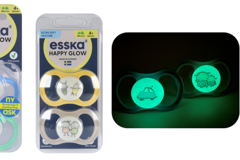 Företaget Esska återkallar nappar med självlysande knopp av märket Happy glow.