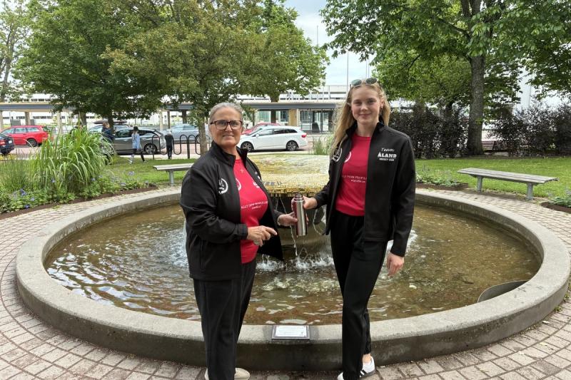 Det var simmaren Olivia Weuro, som fått äran som vattenbärare, som skopade upp vatten i en silvrig termos. Vattnet kommer från fontänen vid torget som invigdes vid öspelen på Åland 2009.