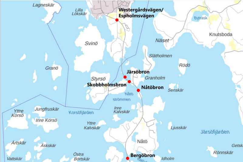 De så kallade sonderingsarbetena sker öster om korsningen Espholmsvägen - Westergårdsvägen- Järsövägen, vid Järsöbron, vid Skobbholmsbron samt vid Nåtöbron och Bergöbron.