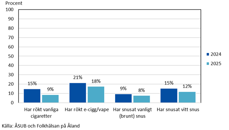 Elever på högstadiet röker, snusar och dricker mindre alkohol 2025 än 2024. Det visar en ny undersökning som Folkhälsan på Åland och Ålands statistik- och utredningsbyrå (Åsub) gjort gällande ungdomars vanor när det gäller alkohol, narkotika, dopning, tobak, spel och digitala medier.