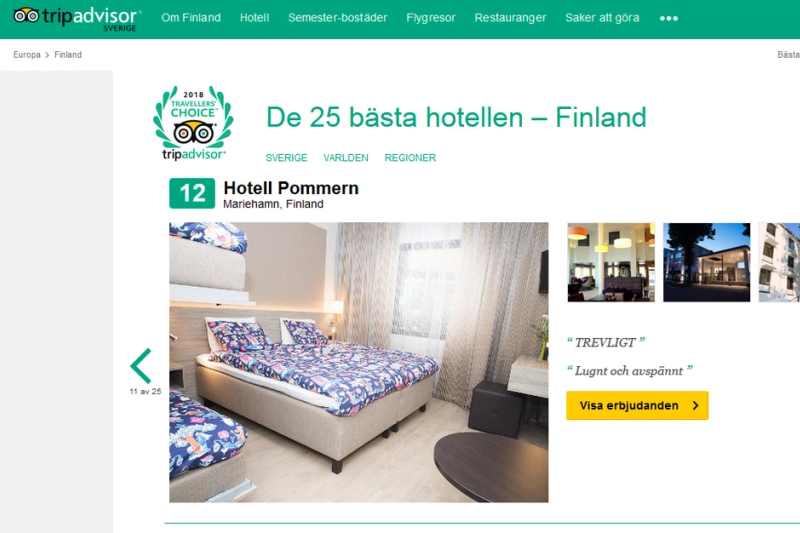 Hotell Pommern hamnar på tolfte plats när resesajten TripAdvisor listar de 25 bästa hotellen i Finland. Det skriver Ålandhotels vd Caroline Lepistö i ett pressmeddelande.