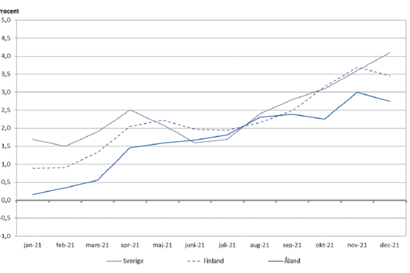 Ser man enbart till december så steg de åländska konsumentpriserna med 2,8 procent jämfört med samma månad 2020. De finländska konsumentpriserna steg med 3,5 procent i december och de svenska konsumentpriserna med 4,1 procent.