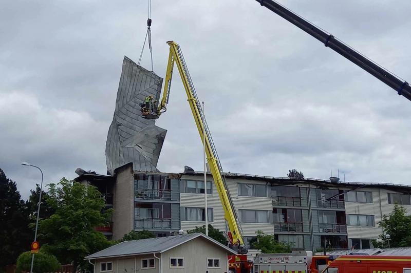 –Vad gäller branden ser det mycket lugnt ut för tillfället. Vi har just påbörjat att ta bort yttertaket, säger Koskinen.