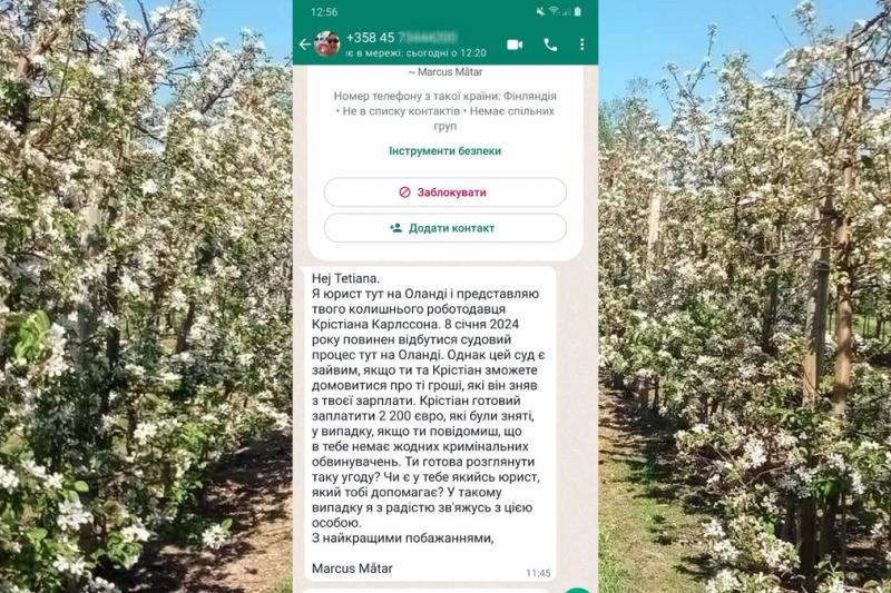 Målsägande Tetiana Dzikovska (tidigare Dordiuk) har med hjälp av arbetarskyddet vid Egentliga Finlands regionförvaltningsverk anmält Karlsson då han kvittat kostnader för skador på äppelträd och en bil mot målsägandens lön.