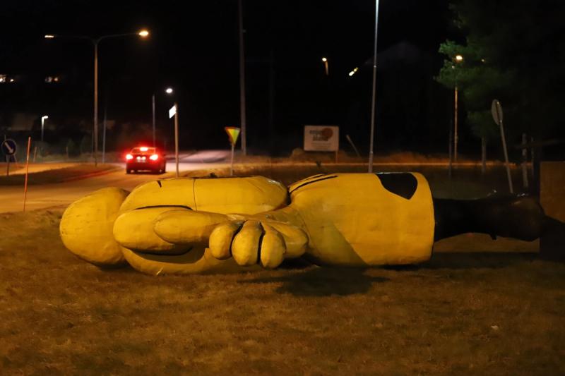 Som ett resultat av stormen Hannes har Sparhallengubben blåst omkull och brutit handen.