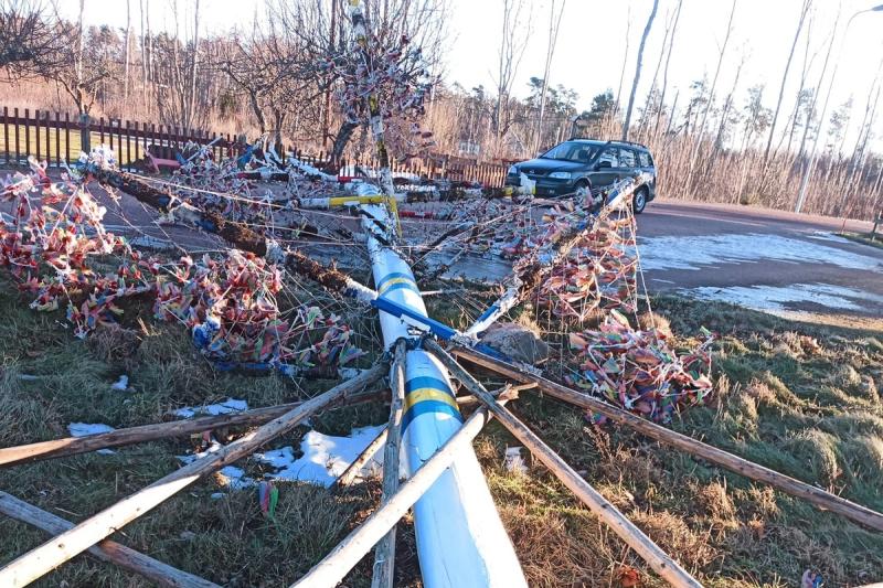 Midsommarstången i Överby i Eckerö blåste omkull i stormen på fredagseftermiddagen.