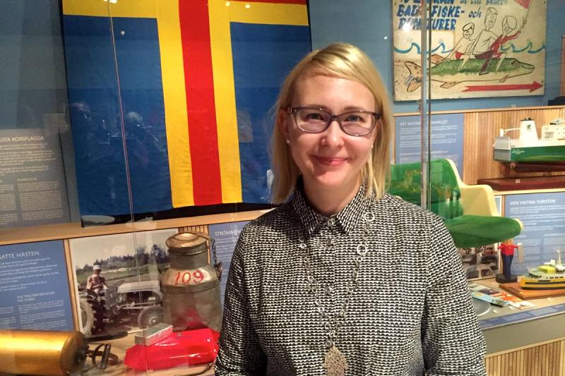På inbjudan av lagtingets talman Johan Ehn, moderat, får hon under två dagar ingående information om det åländska samhället och de frågor som är aktuella i relationen mellan riket och landskapet. En sak som hon uppskattade när hon under pressträffen i Ålands museum på eftermiddagen inledde kort på svenska, men sedan svarade på frågorna på finska.