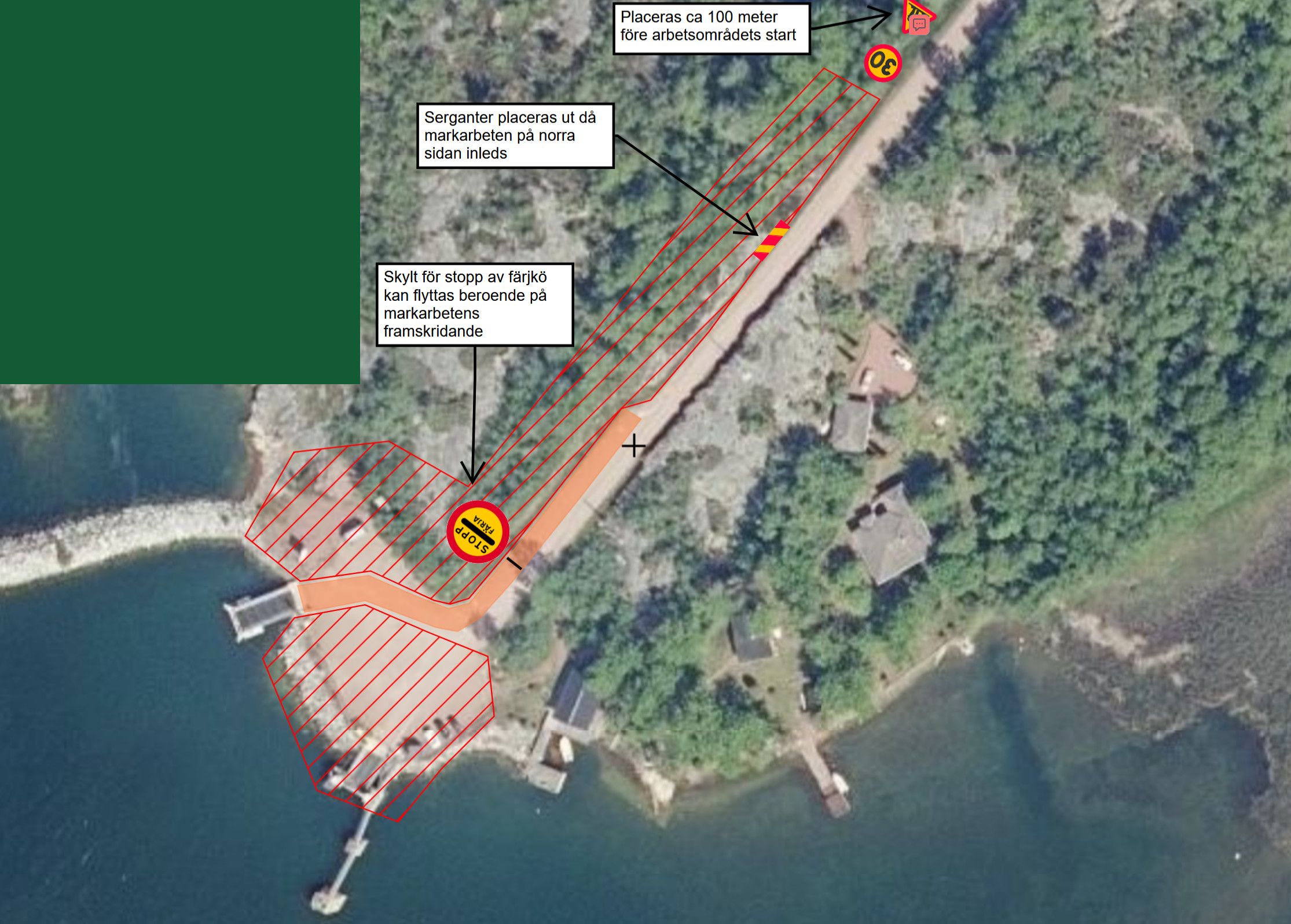 En sänkning av hastighetsbegränsningen införs och blir 30 km/h. Skylten för stopp av färjkö kan flyttas utifrån var i processen markarbetet befinner sig i.