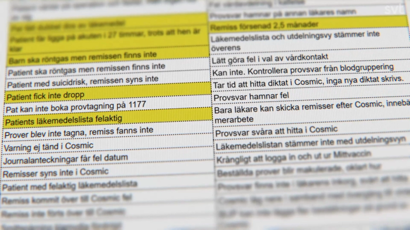 Uppdrag granskning har gått igenom anmälningar från nio av de 17 svenska regioner som i dag använder Cosmic och identifierat sju fall där systemet pekas ut som en bidragande faktor.