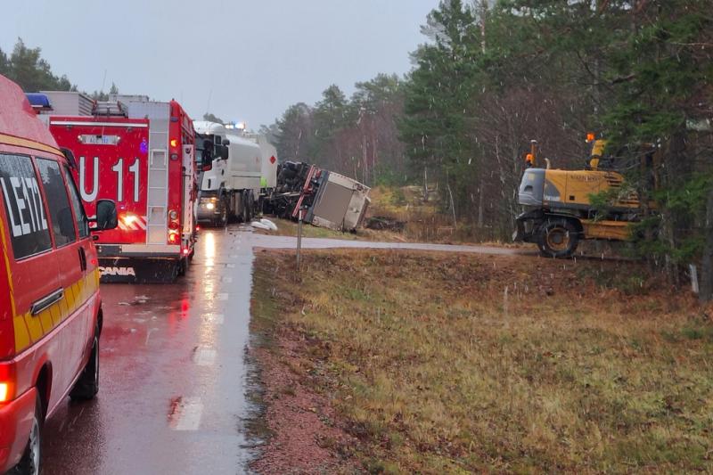 – Det är en dragbil som ligger i diket på sidan och läcker brännolja, hur mycket som läckt ut vet vi inte i nuläget, säger Krister Koskinen, räddningsledare i beredskap.