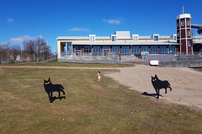 Mariehamn tar till nya metoder för att försöka skrämma bort gäss från stadens stränder. I sommar sätter man upp plywoodskyltar föreställande vargar på stranden vid Mariebad.