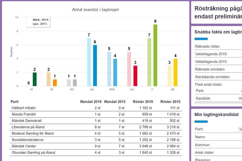 Centern går framåt från sju till nio mandat medan Obunden samling ökar från tre till fyra mandat. Hållbart initiativ kniper två mandat. För Åländsk demokrati blir det en ny mandatperiod med en ledamot i lagtinget.