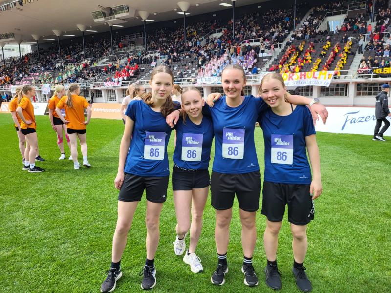I laget sprang Teodor Bergvall, Viggo Clemes, Filip Lehtinen och Julius Holmberg. Laget kom i mål på tiden 44,68. Vann gjorde Kyrkslätts gymnasium på 44,47 och Petalax gymnasium kom tvåa på 44,50.