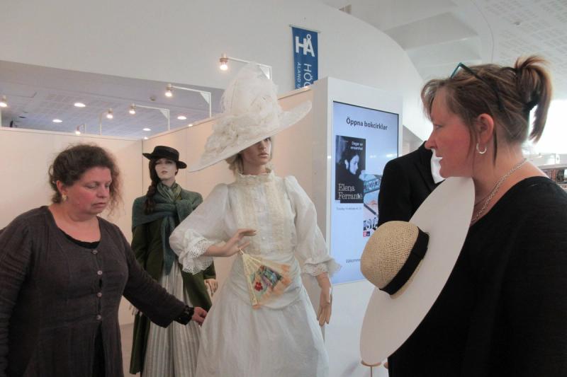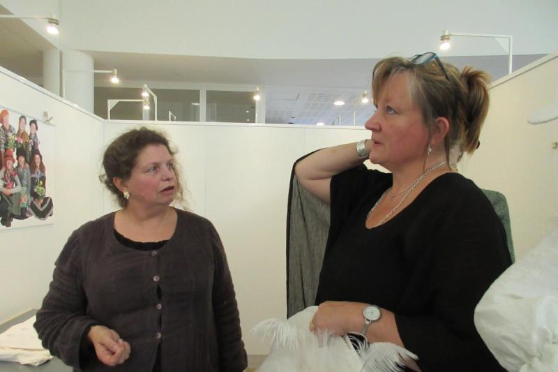 De bägge kreativa och effektiva damerna visar nu delar av arbetet bakom kulisserna i en utställning på stadsbibilioteket som de kallar Innan ridån går upp. Totaslt ingår närmare tt hundratal klädbyten i musikalen, det kortaste ska göras på 17 sekunder men det ska gå intygar de. Bakom scenen råder ett organiserat kaos, i tystnad och med dålig belysning dessutom! Budgeten för kostymeringen är i minsta laget så mycket material hämtar de från Emmaus - drottningens klänning t ex är en brudklänning inköpt där och omgjord. Det svåraste är egentligen patineringen - kläderna ska ju inte se nya ut utan när de väl är sydda ska de inte sällan förses med smuts och fläckar också. Jag har gnidit många teaterplagg genom åren på stadshusets parkering för att få dem skitiga berättar Lena Andersson - textilfärg i sprayflaska är en annan metod intygar Gunilla Nilsson.