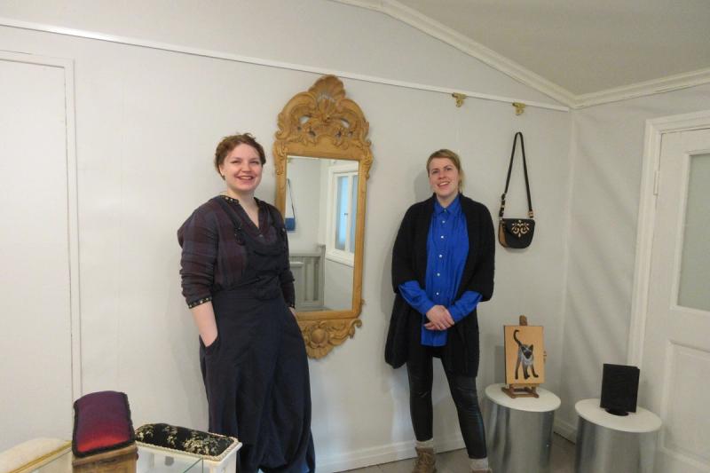 På Galleriet ställer kusinerna Saija Saarela och Tuovi Karhu ut tillsammans, den förra visar arbeten i läder, den senare träsniderier. För Saija Saarelas del har tanken varit att ge mer utrymme för det kreativa, vid sidan av funktionaliteten så de väskor och pärmar/bokomslag i läder hon ställer ut nu är dekorerade på olika vis. Här finns bl a en bild av en katt som ser så verklig ut att den närsomhelst kunde ta språnget ut ur sitt sammanhang. Tuovi Karhu visar bl a rikt utsirade spegelramar och små hyllor med krusidulliga konsoler. Hon tillverkar också yogapallar dekorerade med mytologiska symboler. När man går sin utbildning har man tillgång till allehanda avancerade maskiner men sen när man ska jobba i egen verkstad måste man uppfinna nya arbetsmetoder för att man kanske bara har en cirkelsåg att tillgå konstaterar Tuovi. På Stonehuset, Jussis gamla glashytta mitt i stan öppnar ikväll också en popup-utställning med verk av Alexandra Trizna. Hon kallar den Det är dags - dags att visa upp sin konst i en bred utställning men också dags att gå vidare till nya uttrycksformer så vad plexiglasmplandet beträffar är den här utställningen samtidigt grande finale. Också på Galleri Skarpans är det vernissage i kväll - om den utställningen berättar Kulturen mer i morgon.