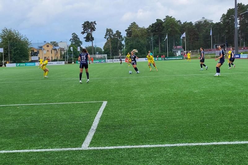 Det blev en målrik historia där HJK var i ledningen och Åland United kom i kapp tre gånger. Efter åtta minuter tog gästerna ledningen. När det hade spelats 22 minuter fick ÅU frispark just utanför offensivt straffområde. Olivia Ulenius sköt bollen i ribban och ner på linjen, därefter hann Anni Hakasalo först fram och tryckte dit kvitteringen. Några minuter senare gick HJK till ledningen igen, men ÅU kvitterade än en gång. Firma Ulenius-Hakasalo var framme igen med fem minuter kvar av den första halvleken. Den här gången var det Hakasalo som slog ett inlägg som Ulenius kunde trycka dit vid bakre stolpen. Men just innan halvleken var slut tog HJK ledningen för tredje gången.