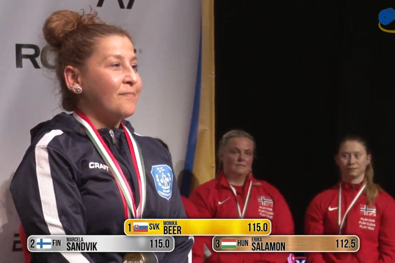 I 57-kilosklassen för damer var det tyngsta lyftet som gjordes under söndagen 115 kilo. En vikt som Marcela Sandvik lyfte i sitt tredje försök, vilket tog upp henne till samma vikt som slovaken Monika Beer tagit tidigare. Men då Beer väger mindre än Sandvik vinner hon guldet. Bronspengen gick till ungraren Erika Salamon som lyfte 112,5 kilo.