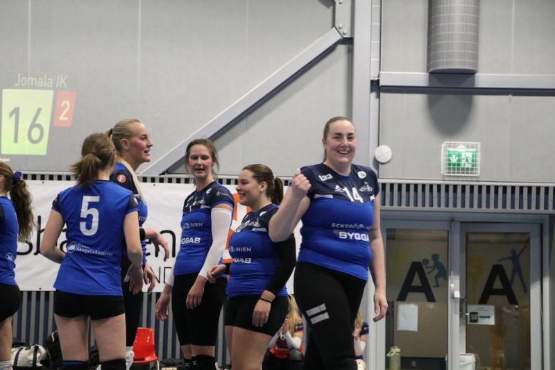 Damerna i Jomala IK vann med 3-1 (20-25, 25-22, 25-20, 25-12) i set mot nästjumbon KFUM Skellefteå i volleybollens division ett under söndagen hemma på Vikingagården.