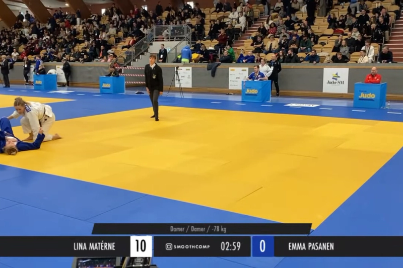 I öppningsmatchen i damernas 78 kilosklass skadade Emma Pasanen axeln och kunde inte fortsätta tävla i SM i judo.
