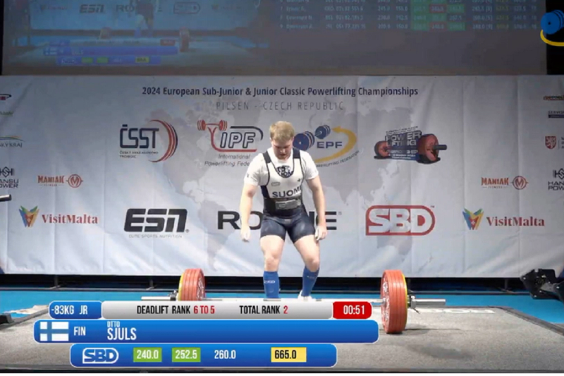 Otto Sjuls tävlar i U23-klassen och kom på elfte plats med den totala vikten 665 kilo, vilket var fem kilo mindre än vad han tog i junior-VM i slutet av augusti. Han satte nytt personligt rekord i knäböj med 242,5 kilo.