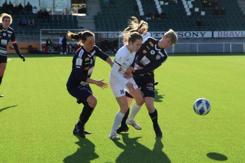 Det var spel mot ett mål i stora delar av första halvlek och PK35-målvakten Tanja Kotoaro fick arbeta hårt för att hålla siffrorna nere. Jacqui Hands skott styrdes i stolpen, Kit Loferski sköt strax utanför och Margarida de Sousas fick för lite träff på nickskarven som gick precis förbi stolpen. Men på tilläggstiden rann bollen igenom ÅU-försvaret till Emilia Kupsanen som placerade reduceringen till 2-1 nere vid bortre stolproten.