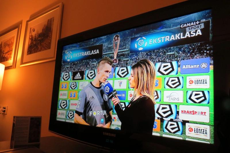 Bild 3 av 3På hotellets tv vevas bilder av Legia Warszawas nederlag i helgens premiär i den polska ligan. Ett gott tecken eller bara ett extra revanschlystet motstånd som väntar IFK? Foto: Hasse Persson-Bru.