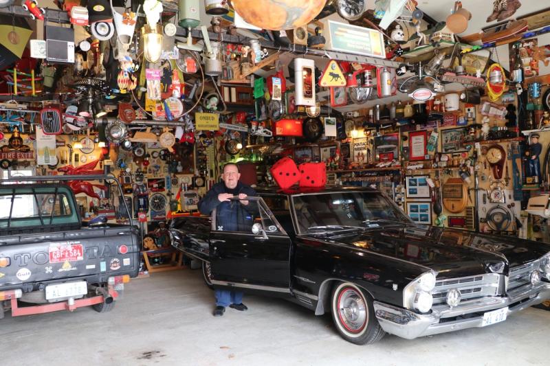 Hela hans dubbelgarage på gården är fullt med prylar från när och fjärran, likaså inne i bostaden. Samlingen är mångfacetterad och objektens montering är genomtänkta.